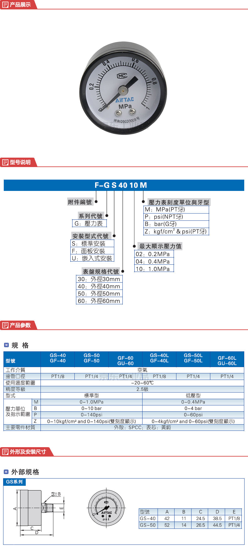 AirTAC/亚德客 标准安装压力表 F-GS4004M
